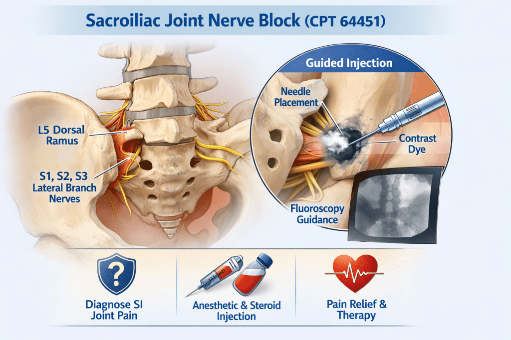 The sacroiliac (SI) joint is a well-recognized source of low back and buttock pain. Due to its complex anatomy and variable innervation, diagnosing SI joint–mediated pain can be challenging. Sacroiliac joint nerve blocks play a critical role in both diagnosing and treating this condition. CPT code 64451 was created to more accurately describe injections targeting the nerves innervating the sacroiliac joint rather than intra-articular injections.
