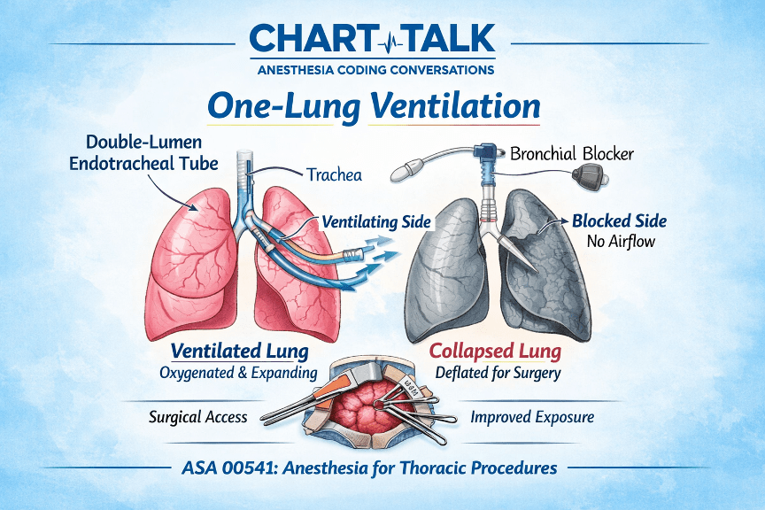 While one-lung ventilation is not coded separately, recognizing it in the anesthesia record helps coders understand the complexity of thoracic anesthesia services and supports appropriate anesthesia CPT code selection.